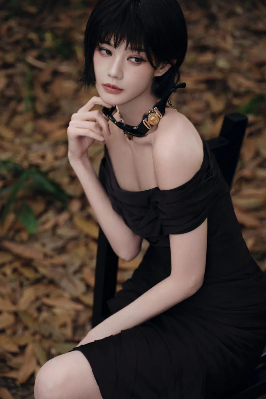 那件黑色露肩连衣裙的设计很绝,不对称的肩带和抹胸褶皱把她的直角肩和纤细锁骨衬得更明显了,皮肤在黑色面料衬托下白得发光。