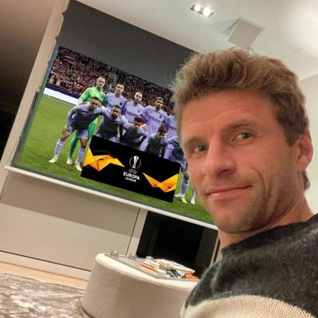 穆勒:在家看巴萨踢欧联多是一件美事儿啊↑