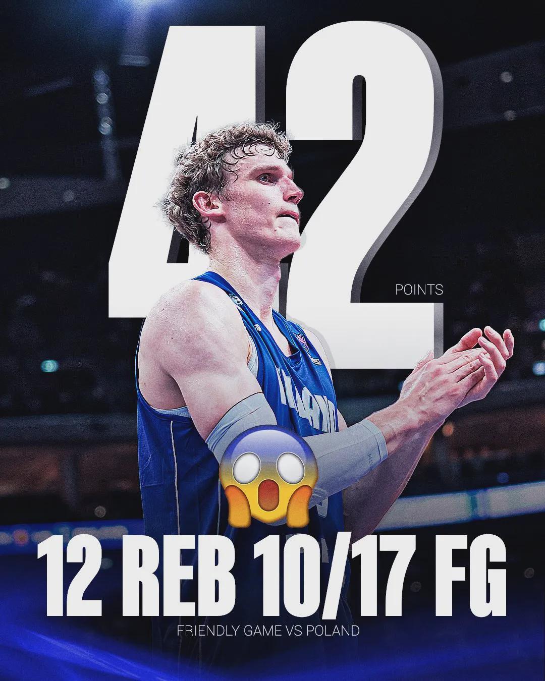 过去三场热身赛,马尔卡宁分别砍下48分、31分和42分,合计121分进账,绝对的FIBA超级大杀器。